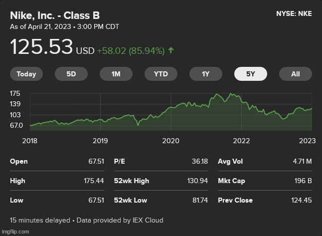 If you want to look at Nike the stock is up 80.46% over the past 5 years.