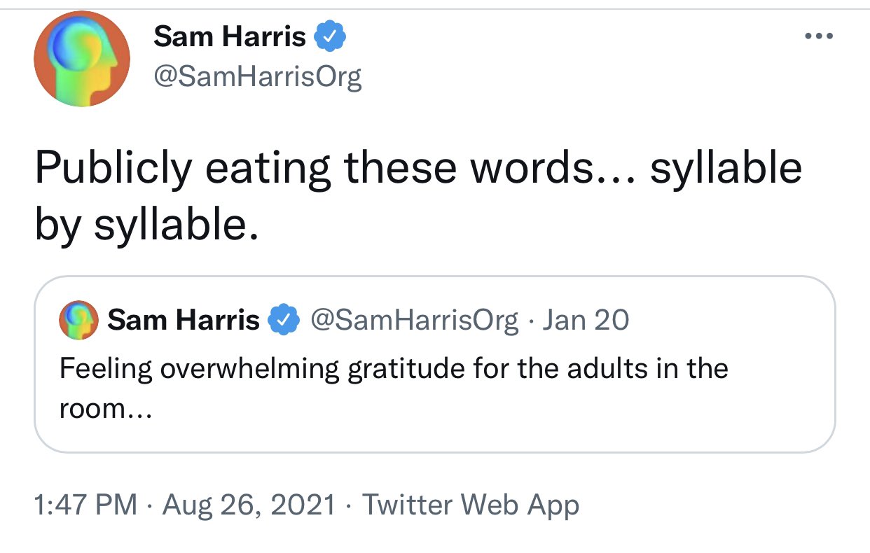 Or failing to show this tweet from their mutual friend Sam Harris. That’s when Dave would realize how serious this is when Sam Harris admits he fricked up on something in regards to Trump: