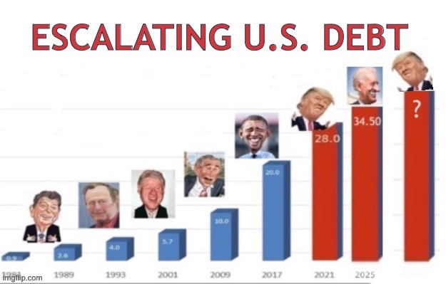 Steal your money - check, taxes have not decreased and all talks of things like ending the IRS are gone. Instead, we got the BBB which increased government spending. Which leads to: