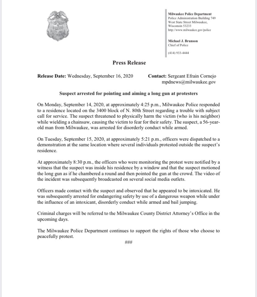 "The Milwaukee Police Department continues to support the rights of those who choose to peacefully protest"