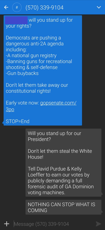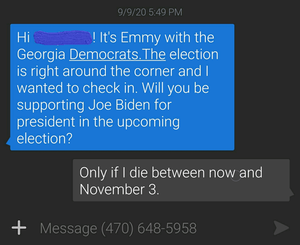 The ONLY benefit to the fake-arse narrative that Georgia is some manner of "swing state" is that I get these texts all the time. Responding to them in the most infuriating way possible to the recipient is a bit of a pastime of mine.