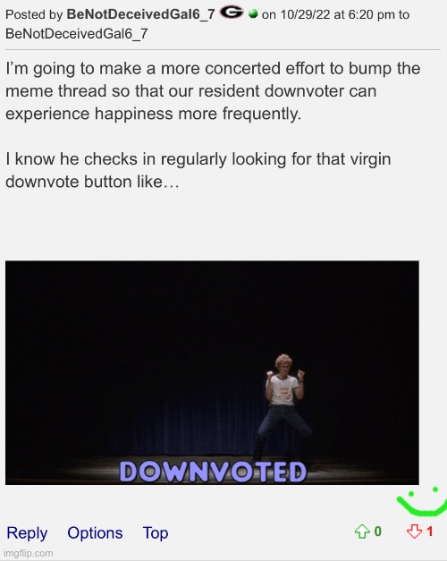 I’m going to make a more concerted effort to bump the meme thread so that our resident downvoter can experience happiness more frequently.