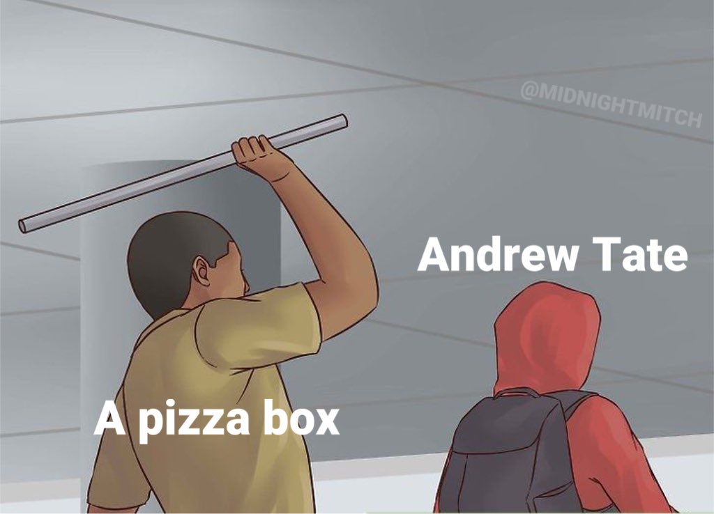 This won't go over well, but if the pizza box really did do in Cobra Tate, you have to laugh. I am skeptical of the whole story, though.