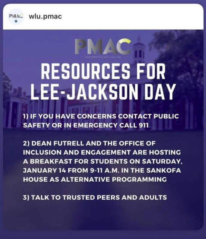 Lee-Jackson day was celebrated last weekend in Lexington, VA by a bunch of Confederate reeanactors. Washington-Lee University posted this for that portion of their student body that was traumatized.