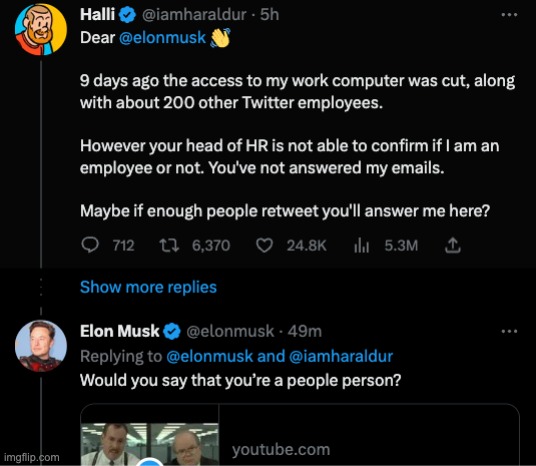 Owner of Twitter is shitposting Office Space vids at a former employee on Twitter