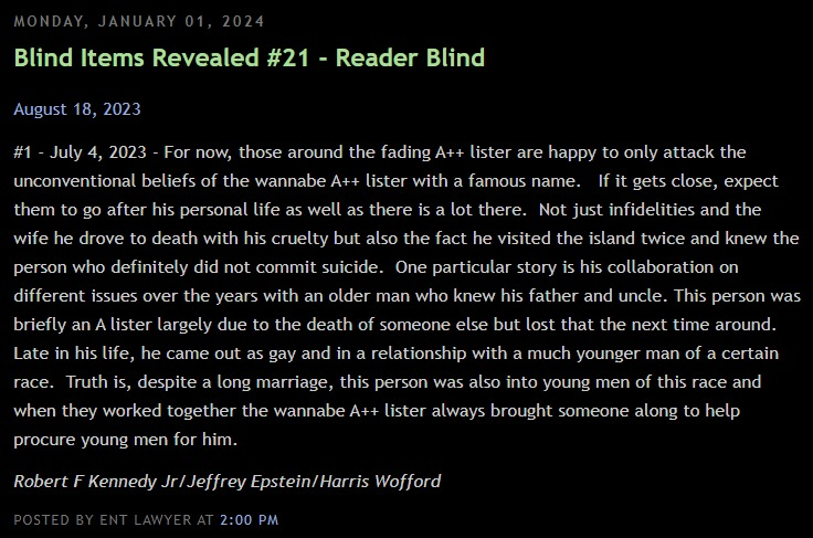 For those not familiar, New Year's day (and Independence Day) is a massive Blind Item reveal on the Crazy Days & Nights blog. Here's one that was relevant: