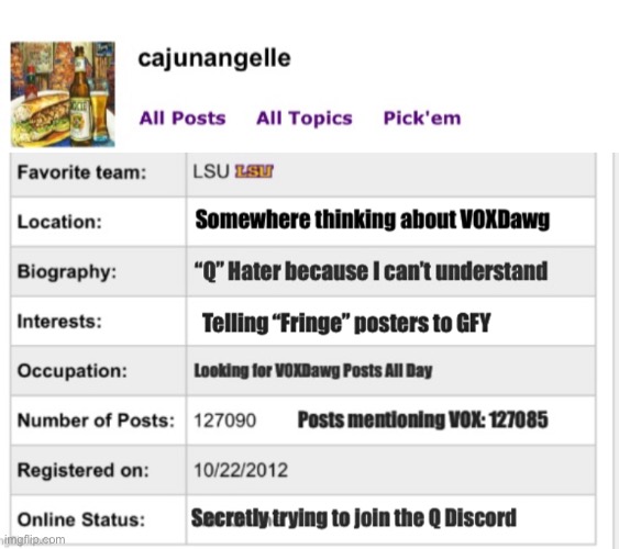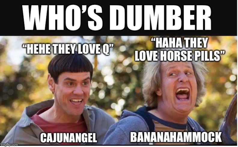My name was brought up regarding their dear leaders bannage. So a few of the fringe groupies decided to hijack this thread and speak about me regarding their cult leaders bannage. I have no problem calling them batshit crazy, anonymous, believing, dipwads; so the lowest IQed lemming and SHOCKTROOPER weirdo decided if they call me crazy no one will see that they are. SHOCKTROOPER has tried to call me out on germans threads; he and Down have tried several times to get their fellow fringe groupies to pile on. It is so juvenile. It is like someone left the door open to BEYOND THE FRINGE.com. Hey SHOCK and DownUnder, GFY it won't work. If you post your fringe I will respond. Take your pile-on bullying crap elsewhere. Now back to posting memes.
