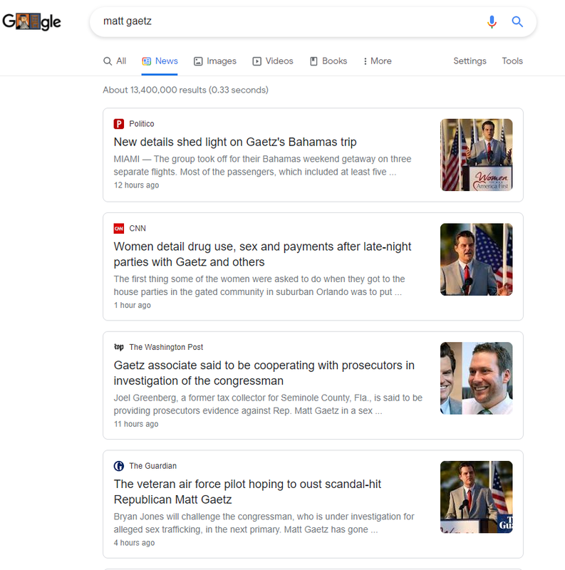 If you've been following this story it's not too difficult to notice that this is a deliberate propaganda witch hunt by the legacy media. I mean just a simple google search this morning on Gaetz gives you this: