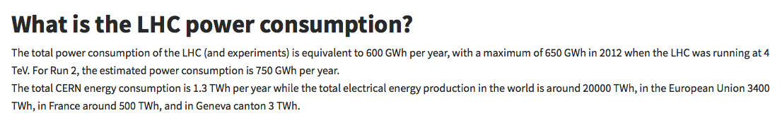 The LHC is probably the single largest user of electricity on the entire planet. Wonder where all that juice comes from? And all in the name of science while shoving climate agenda down the world's throat. Give me a fricking break. Use your fricking heads morons, science ain't that damn important if the climate was truly a big deal.