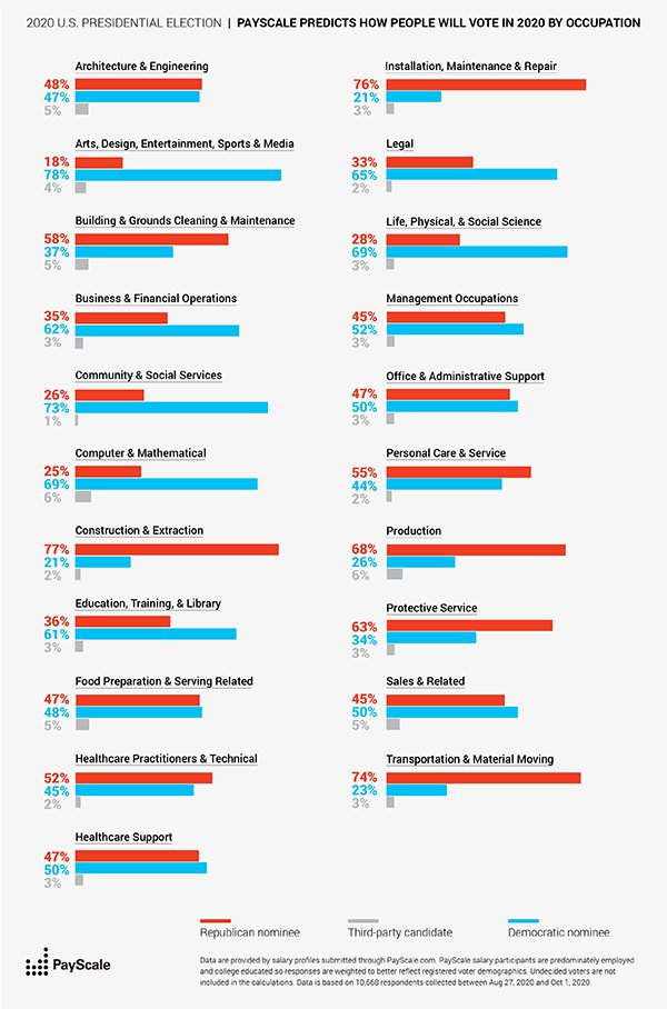 IDK why they lump architecture and engineering together. It doesn't surprise me it's almost 50/50. The Architects are voting Biden and the Engineers are voting Trump. Architects should be lumped in with Arts, Design, Entertainment and Sports & Media.