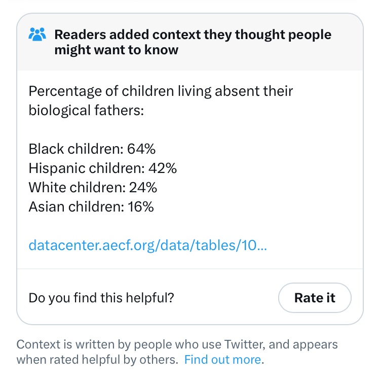 This data about the disintegration of the black family has been established for years now. There's no way to send out a tweet like this unless you are intentionally engaging in propaganda and lies.