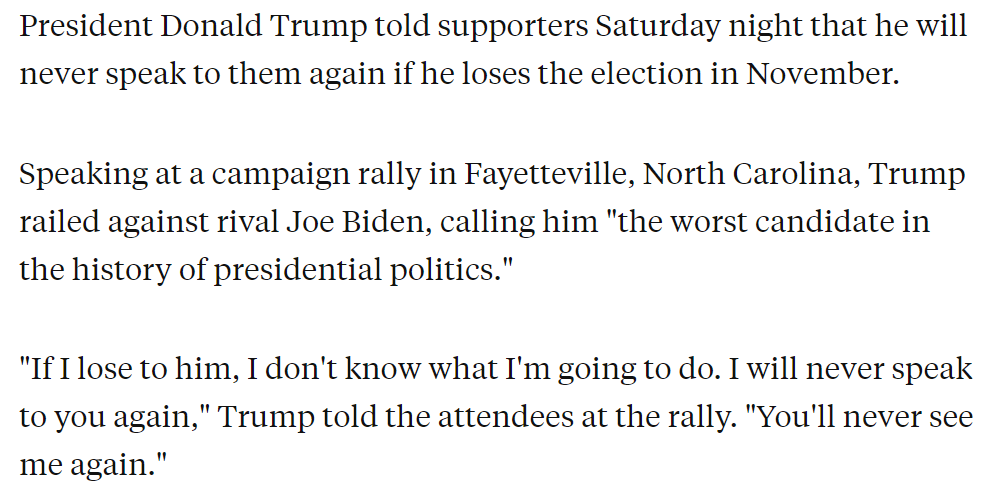 The only one who lied was Trump. He vowed he'd go away and we'd never see or hear from him ever again if he didn't get re-elected. And last time I checked he's not in the White House and he's running again instead of hiding in shame.