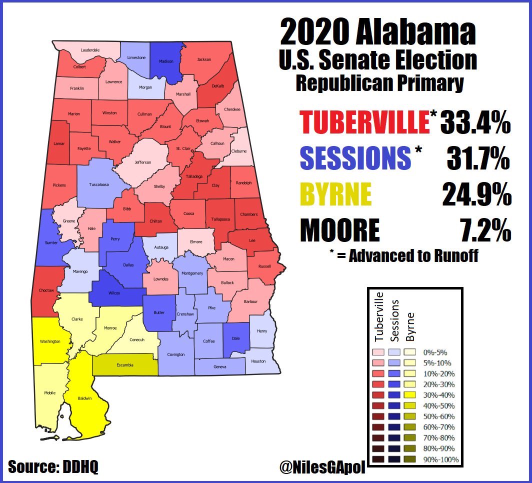 In the first round, Sessions ended up double digits ahead of Tuberville in every county Byrne won. My guess is that Trump and Tubby see this too and are concerned about those areas.