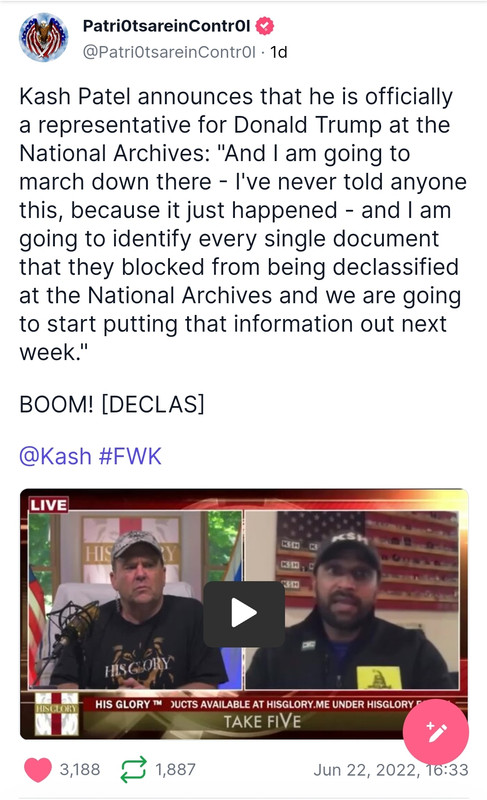 Kash Patel announces that he is officially a representative for Donald Trump at the National Archives: "And I am going to march down there - I've never told anyone this, because it just happened - and I am going to identify every single document that they blocked from being declassified at the National Archives and we are going to start putting that information out next week."