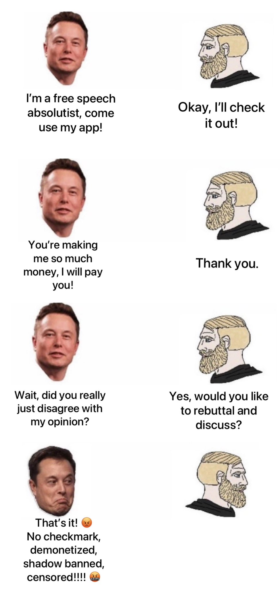 I still like Elon in general but free speech to him means what he finds acceptable. Any actual criticism of him he cannot stand. A total hypocrite on this issue. It's his way or the highway with everything in life -- just look at how he runs his companies (zip2 is a good example, would berate employees for not working past 9pm, not working weekends when he did).