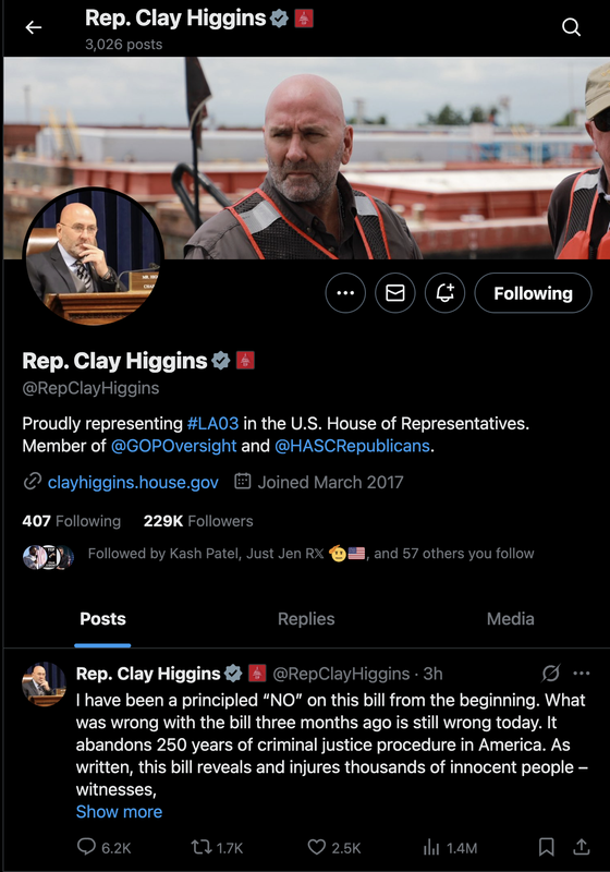 Clay Higgins position in Congress has always made me think that people outside of Louisiana are right when they suspect that intelligence is not necessarily valued here.