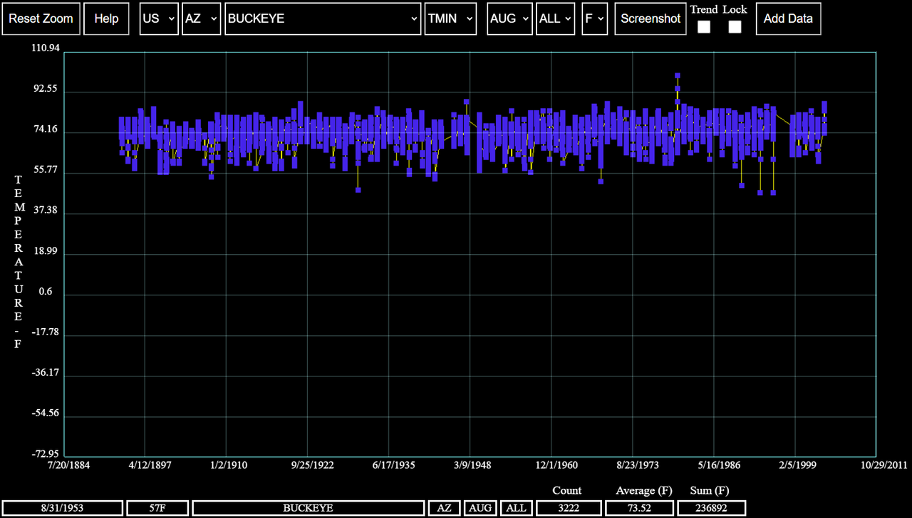 There are no night time lows on that chart. That chart shows the highest temperature recorded during the month of August at the Buckeye weather station (just outside of Phoenix) for all recorded years.