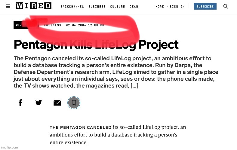 Again, the Pentagon nixed Lifelog on the exact day Facebook was launched.