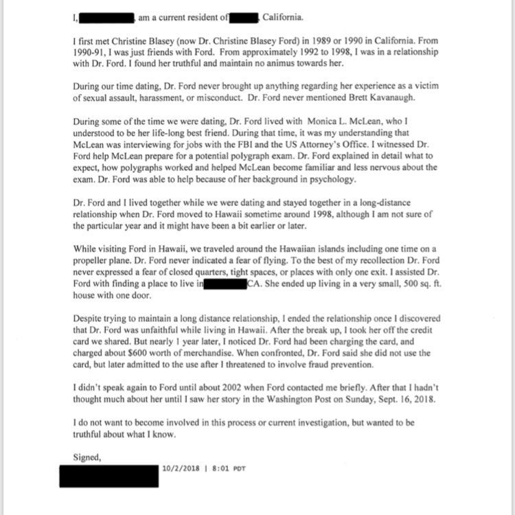 BREAKING: Fox’s @johnrobertsFox obtains letter from Ford ex-boyfriend alleging: dated for 6 yrs, never told of sex assault, Ford coached friend on taking polygraph, flew frequently w/o expressing any fear of flying/tight spaces/limited exits. Doesn’t want to b/c “involved”.