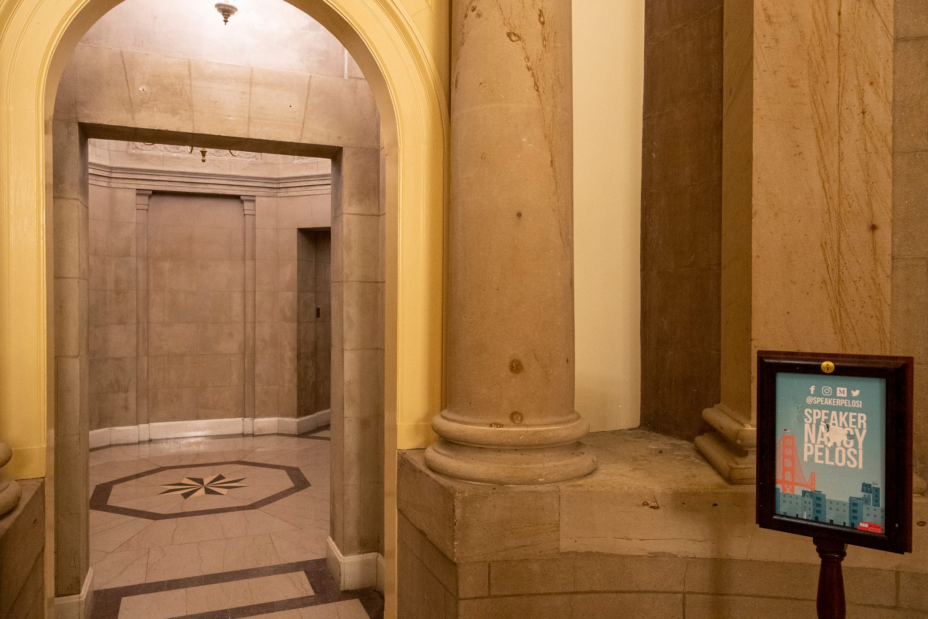 The sign above Speaker of the U.S. House of Representatives Nancy Pelosi's office is missing and another sign is damaged after protesters swarmed the U.S. Capitol.