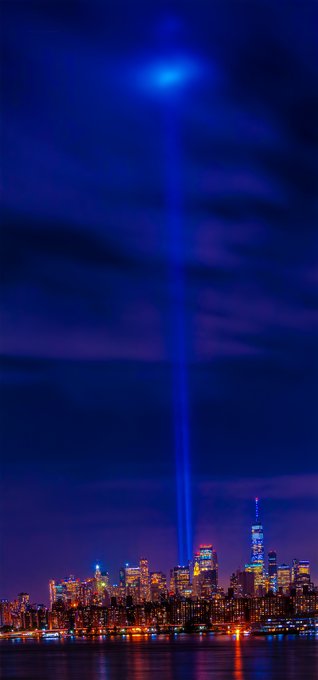 Tribute in Light graces the twilight skies above World Trade Center tonight, in a test run ahead of the 19th anniversary of Sept. 11. #NYC #TributeInLight #NeverForget