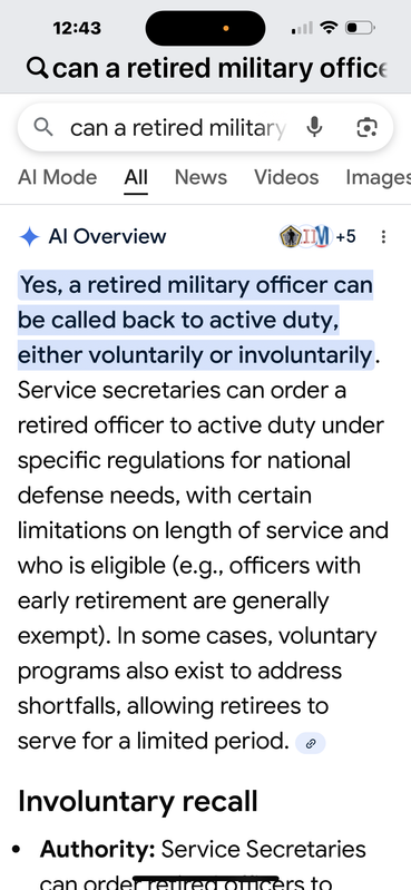 To be clear, you are arguing the Secretary of Defense can recall any retired military officer just for the purpose of trying them for a “crime” they committed while being a post-retirement civilian and even if the violation had nothing to do with their time of service in the military?