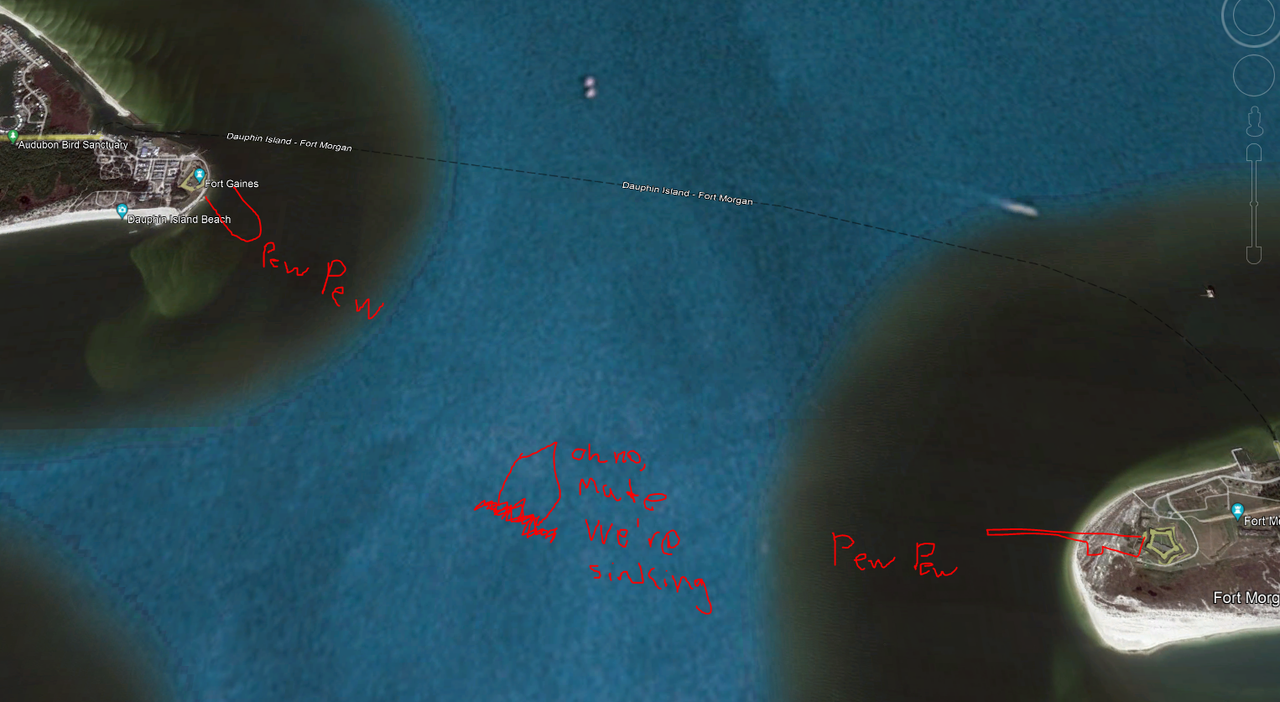 It was when passing between these two forts in 1864 that Admiral Farragut famously said, "Damn the torpedoes, full steam ahead!" before taking Mobile.