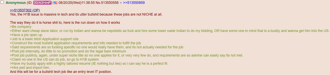 there are ungodly amounts of stories about how an Indian will come in as a CTO or something and then start a daisy chain of H1Bs and fire americans and then (due to contract,) force them to train their Indian replacements.