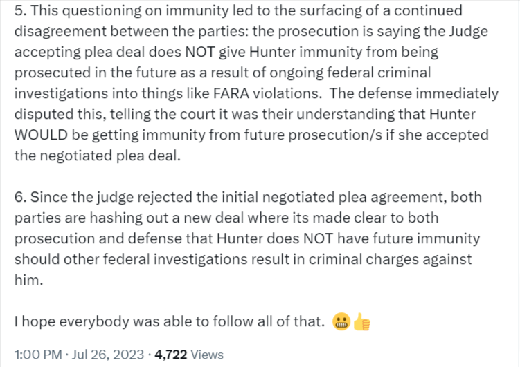 So the DOJ tried to strike a plea deal that allowed Hunter immunity from future prosecutions? I'm surprised that the plea deal did not entail immunity for Hunter's dad too.