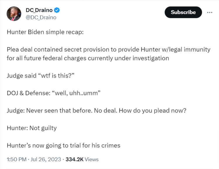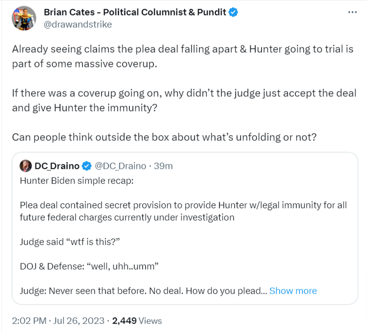 The fact that the judge pointed out immunity from future charges if plea deal was excepted is excellent. This tells me that prosecution was willing to let Hunter skate. I cannot believe democrat judge came through