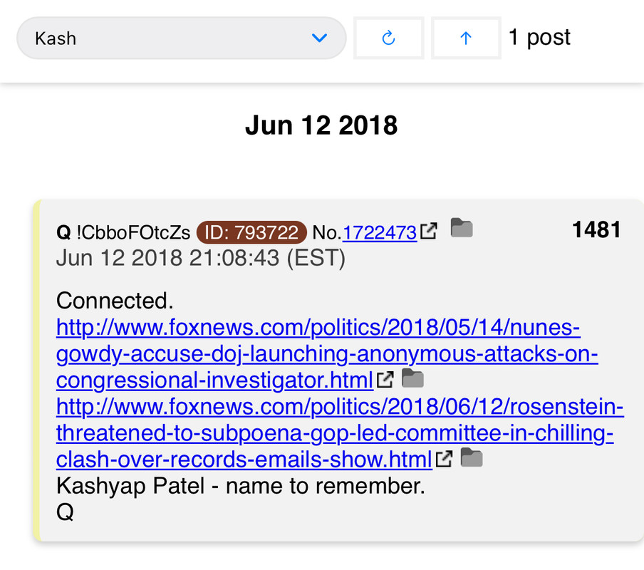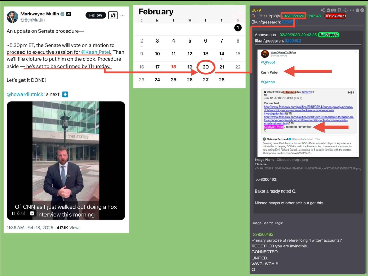 Keep in mind nobody had ever heard of Kash Patel until Q said that's a name to remember on February 20th. Guess when Kash is going to be confirmed. That's right, Feb. 20. This shite is crazy.