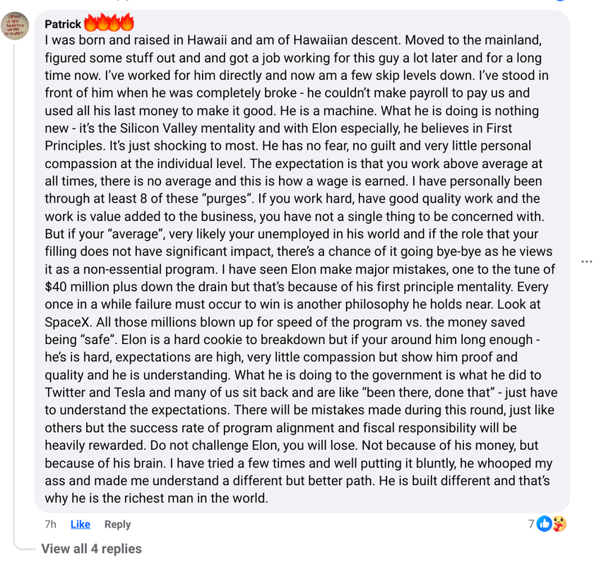 On Elon, posted today in a Hawaii Facebook group I'm in. Someone made a post crying about forest service, VA and other cuts and how ruthless it all is etc... .