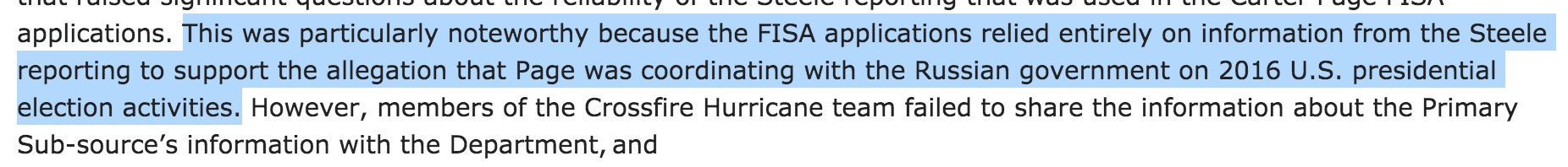 quote: Significant takeaway from the IG report and Horowitz's prepared remarks -- the Steele dossier was the *entire* basis for FBI's belief that Carter Page was coordinating with Russia.