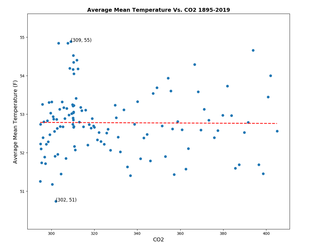 Clearly as the concentration of CO2 increases in the atmospheric mixture the temperature decreases.