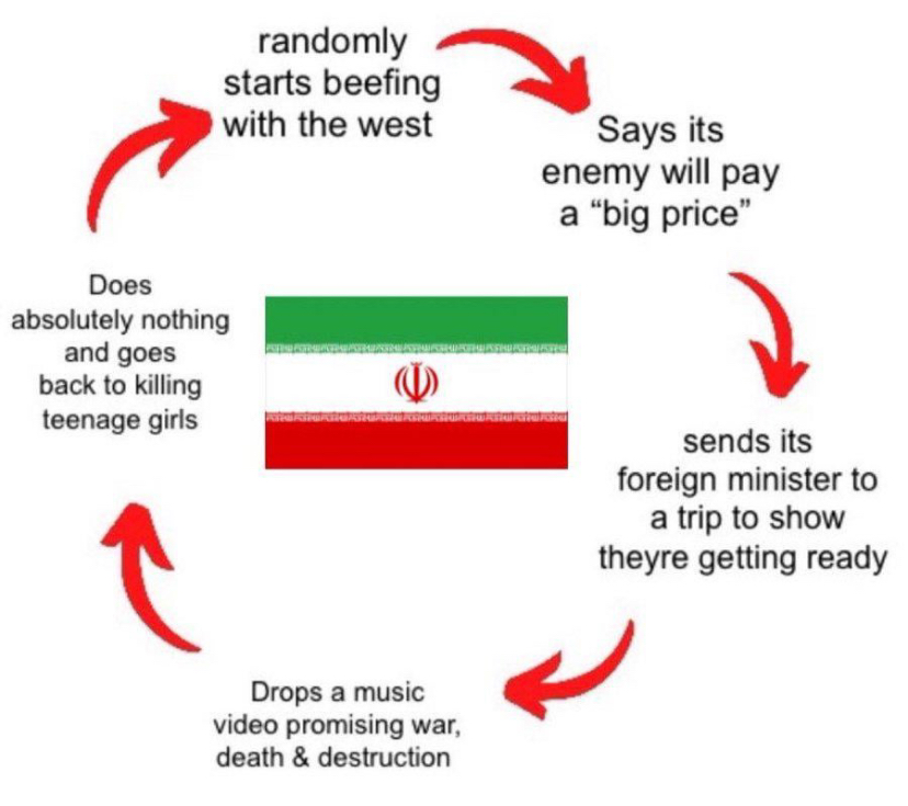 The problem with Iran is that they're a mountainous continental power whose military is designed more for internal pacification than force projection. They have no ability to project force by water whatsoever and their air force would get absolutely chewed up by Israel, the U.S., and U.K. Aside from the aforementioned missiles and drones, their only option is land warfare. Not only do they lack the logistical supply chains to move an army across the desert, but they'd have to do it with no air cover.........a total suicide mission. It would be the Highway of Death Part 2.