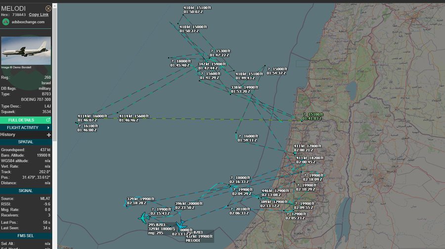 2x Israeli Boeing 707 aircaft up over the Mediterranian currently, but unknown where they have been. Both aircraft have booms and are capable of refueling other planes such as fighter jets in air.