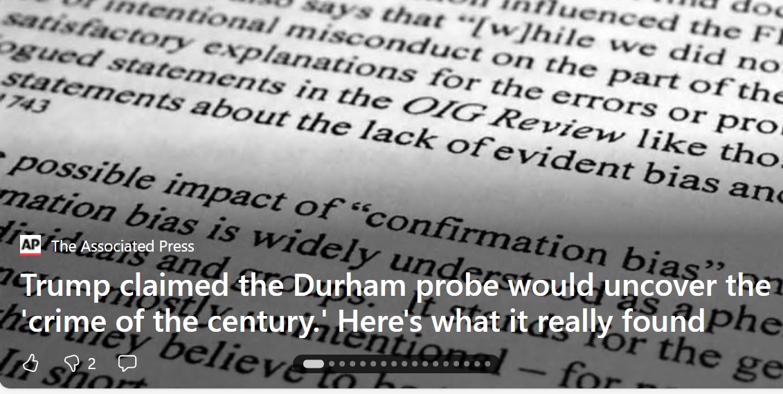 Just as I've said since Durham got appointed, nothing will happen. How are the deluded, who thought Durham was going to start the storm or some crap, going to work this as a positive sign that justice is about to happen?