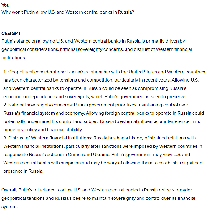ChatGPT gave me what I consider a pretty accurate answer in terms of allowing U.S. and European central banks access to Russia: