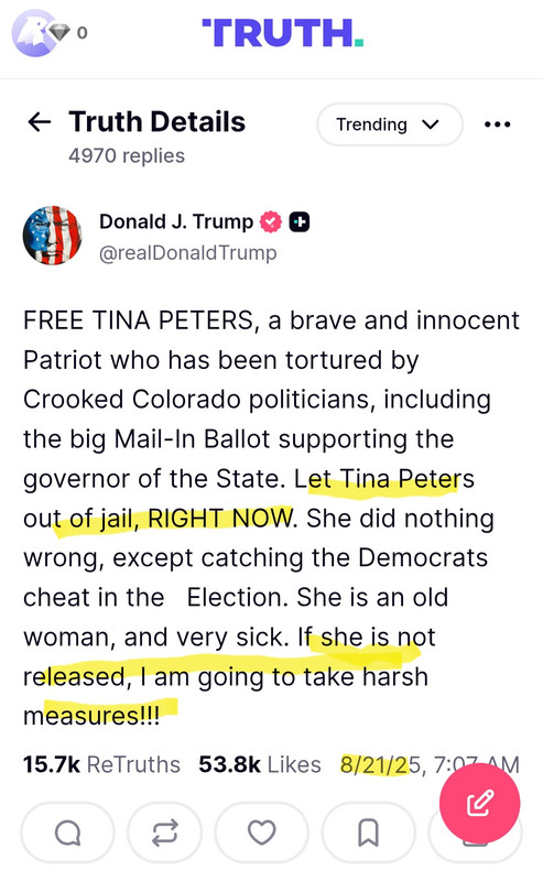 re: Lawyers present Presidential pardon to Tina Peters's jailers. Colorado: "So?"