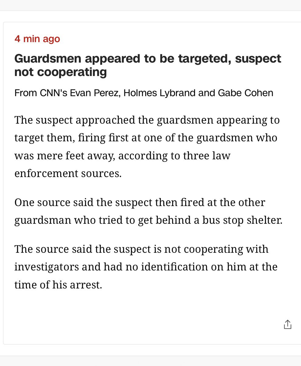 Only suspect shot and apprehended. Targeted shooting of guardsmen.