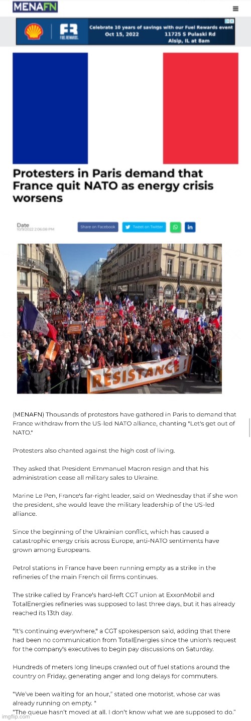 France's refineries have been shutdown due strikes for awhile. NATO has nothing to do with this. Sure looks like nutters or Paid by Putin types.