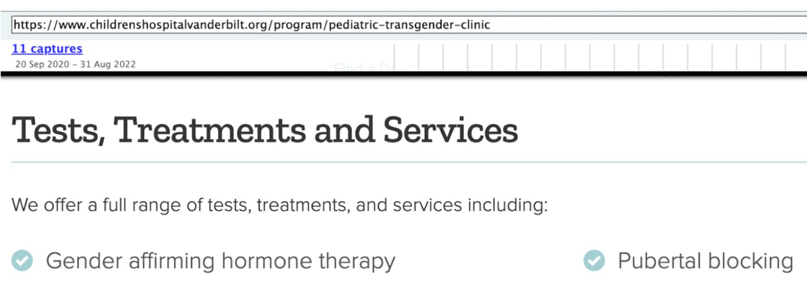 Vanderbilt makes their Trans Buddies available to children, too. They make lots of "services" available to children, including chemical castration. Though at some point in the last month they removed explicit admission of this fact from their site. Here's the archived screenshot