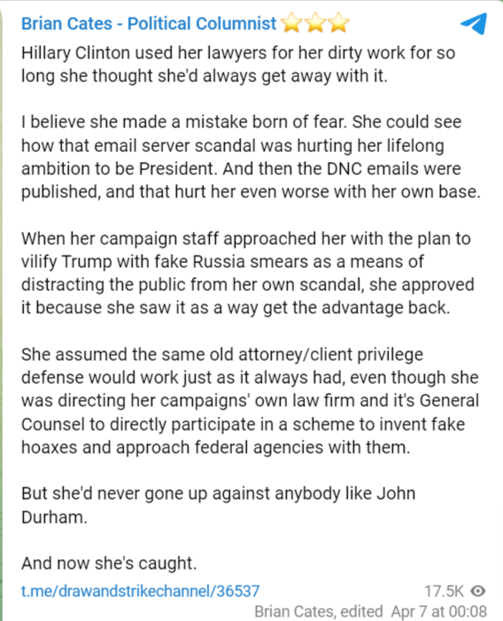 We know from Item 64 filed yesterday that Podesta and other high-ranking Hillary for America folks have been interviewed by Durham's team. All of the scrambling to route this through seemingly low-level flunkies has been for naught.