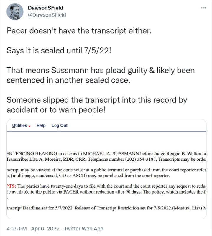 Dawson seems conflicted as to which side might've leaked the sentencing transcript. Was it a strategic move by Durham to set a couple of controlled brush fires, or was it done by some SES/DS flunkie to warn others about the sealed conviction of Sussmann on other charges?