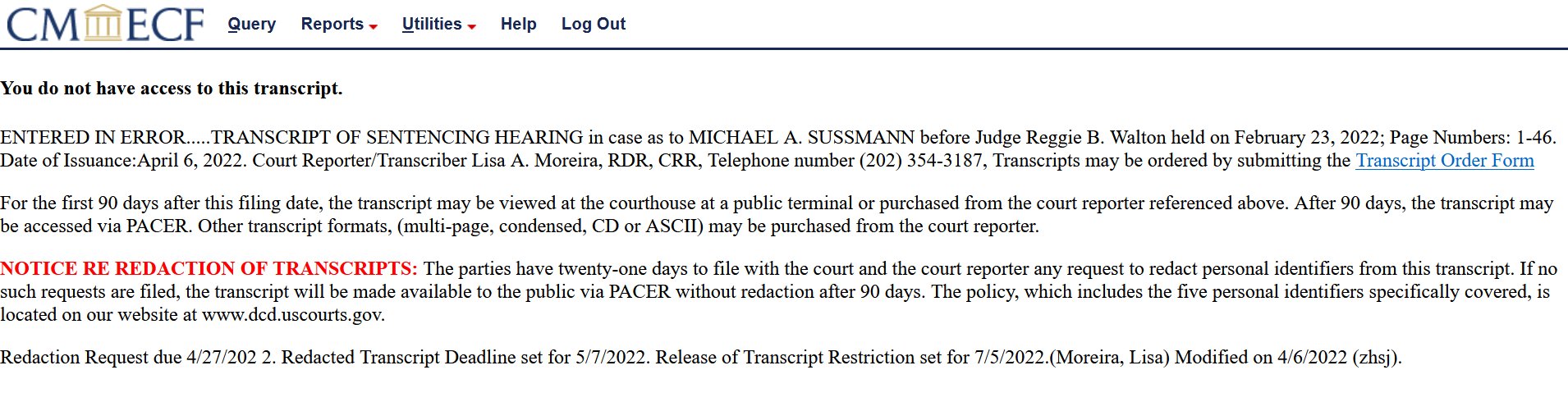 You Quacks now believe Durham has power over PACER and can have a minimum wage clerk file a sentencing transcript into the court record on his order? So the federal judge and their staff is in on this also. What a conspiracy.