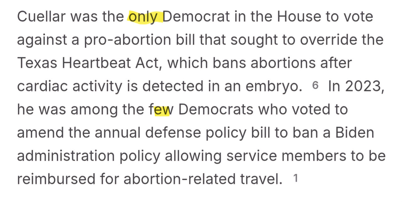 orgot about Cuellar. But, without any evidence to the contrary, I think it safe to say that someone pro-life and against the idea that there are more than two genders is unlikely to be a Leftist.