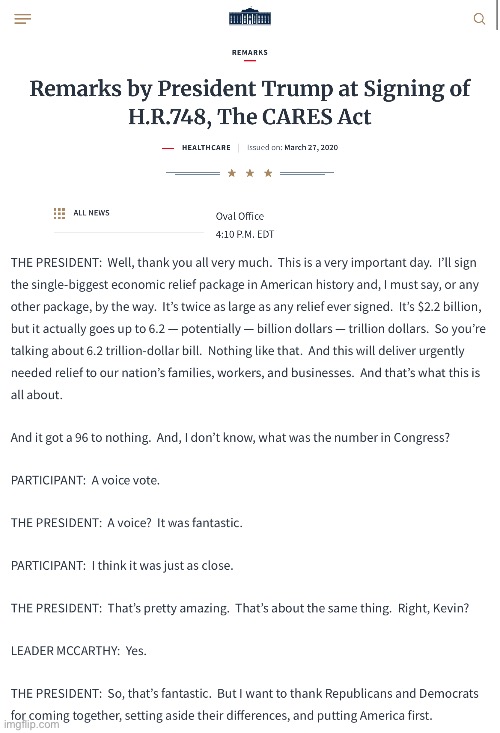 Trump still considers the passing of the inflationary CARES Act as one of the signature achievements of his 1st term.