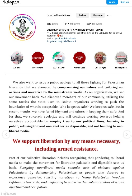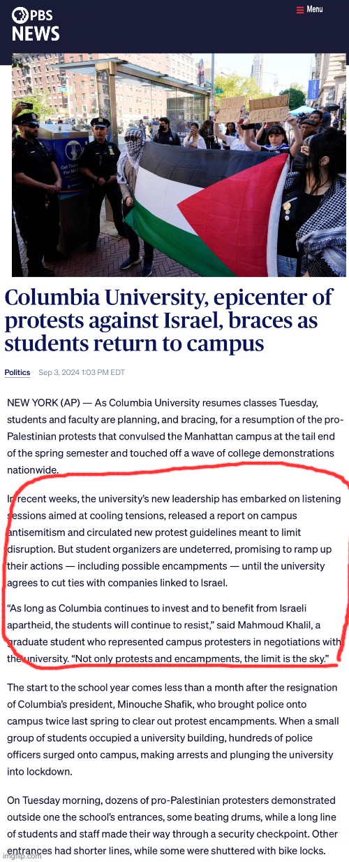 “As long as Columbia continues to invest and to benefit from Israeli apartheid, the students will continue to resist…Not only protests and encampments, the limit is the sky.”