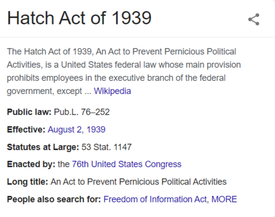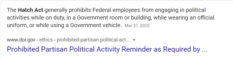 https://www.doi.gov/ethics/prohibited-partisan-political-activity-reminder-required-hatch-act#:~:text=The%20Hatch%20Act%20generally%20prohibits,while%20using%20a%20Government%20vehicle.