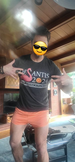 So what's everybody rocking tonight? I've got my "Make America Florida" Ron Desantis soft tee, my Soffe brand 2" inseam retro jogging shorts, my Guccia Lion's head ring in Pewter, and my Nike Trailrunner shoes in a matching creamsicle orange.